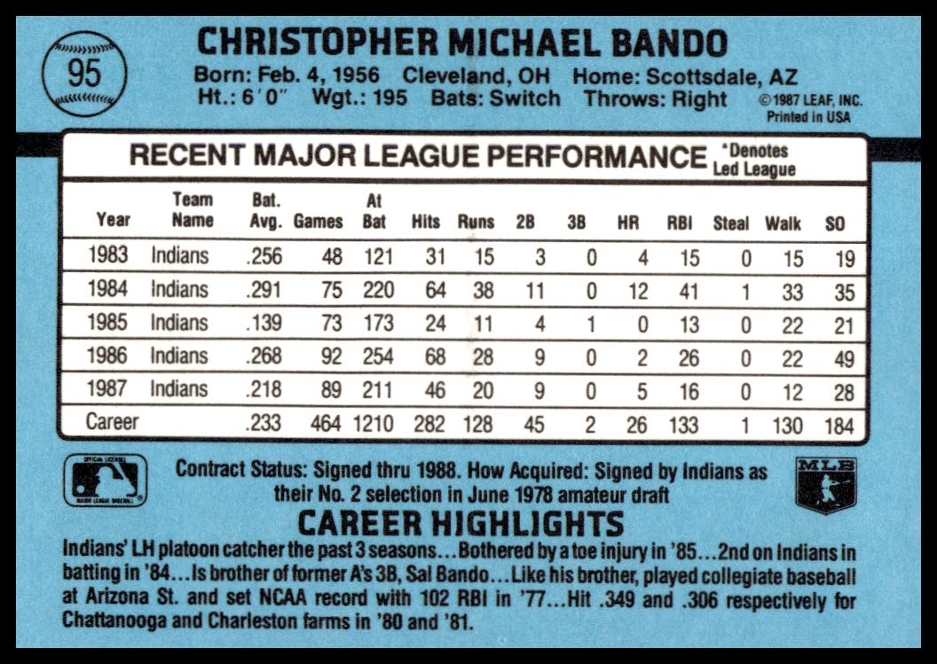 This Baseball card, from 1988 is part of the Donruss  card set. Chris Bando is featured and has a card number of 95.