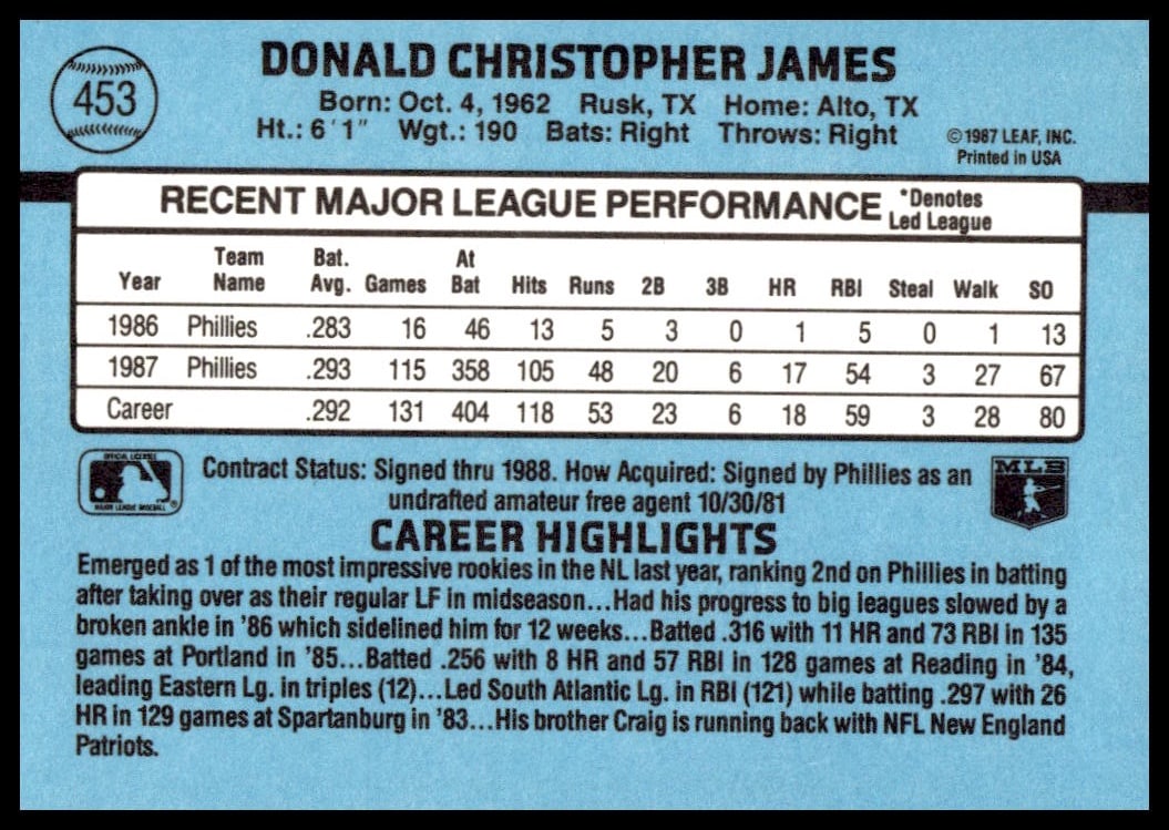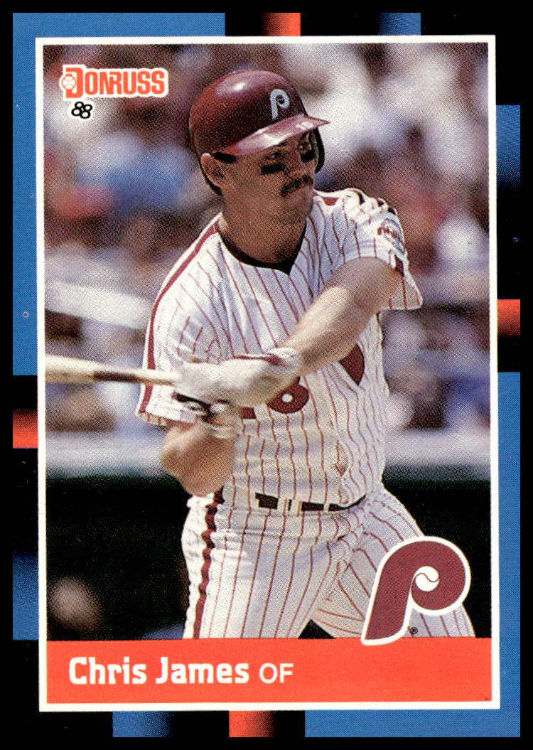 This Baseball card, from 1988 is part of the Donruss  card set. Chris James is featured and has a card number of 453.