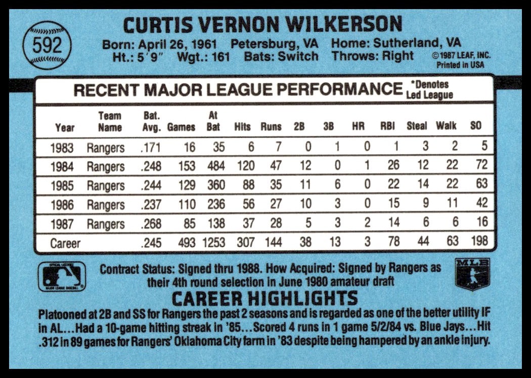 This Baseball card, from 1988 is part of the Donruss  card set. Curt Wilkerson is featured and has a card number of 592.