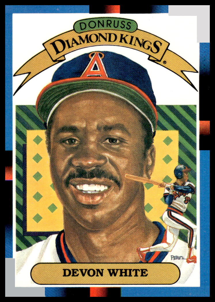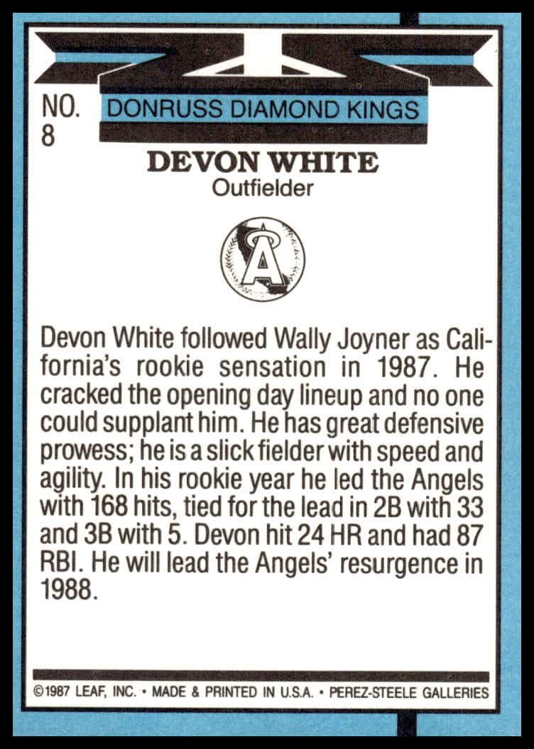 This Baseball card, from 1988 is part of the Donruss  card set. Devon White is featured and has a card number of 8.