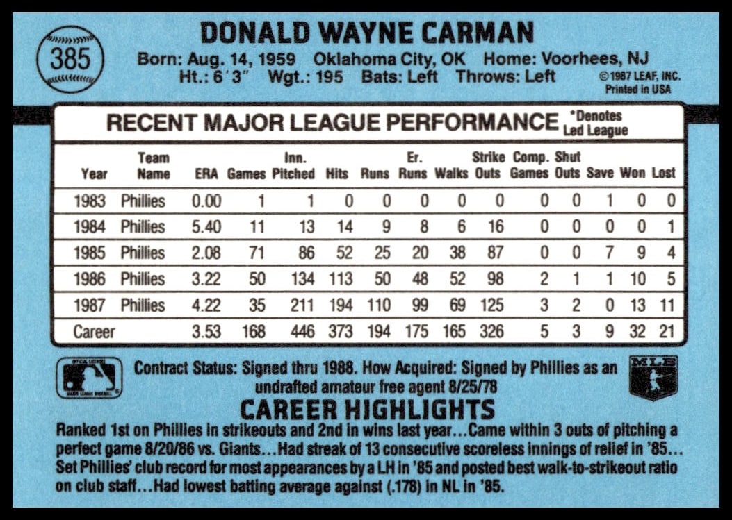This Baseball card, from 1988 is part of the Donruss  card set. Don Carman is featured and has a card number of 385.