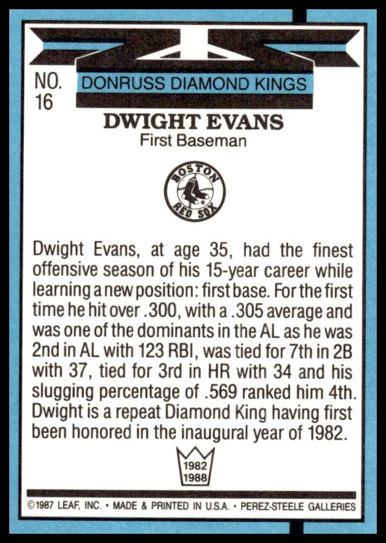 This Baseball card, from 1988 is part of the Donruss  card set. Dwight Evans is featured and has a card number of 16.