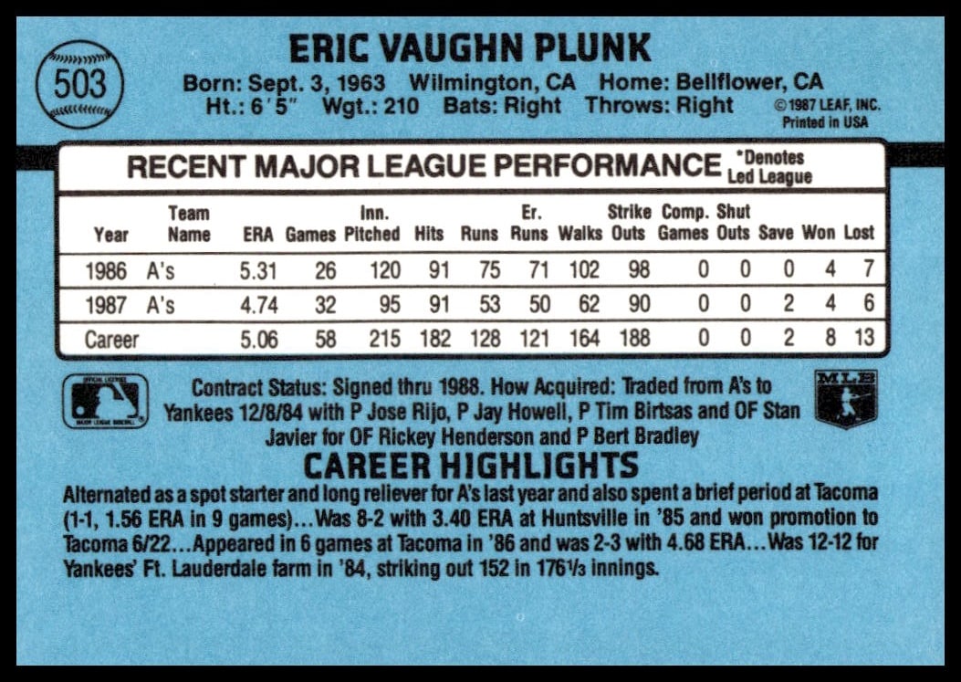 This Baseball card, from 1988 is part of the Donruss  card set. Eric Plunk is featured and has a card number of 503.