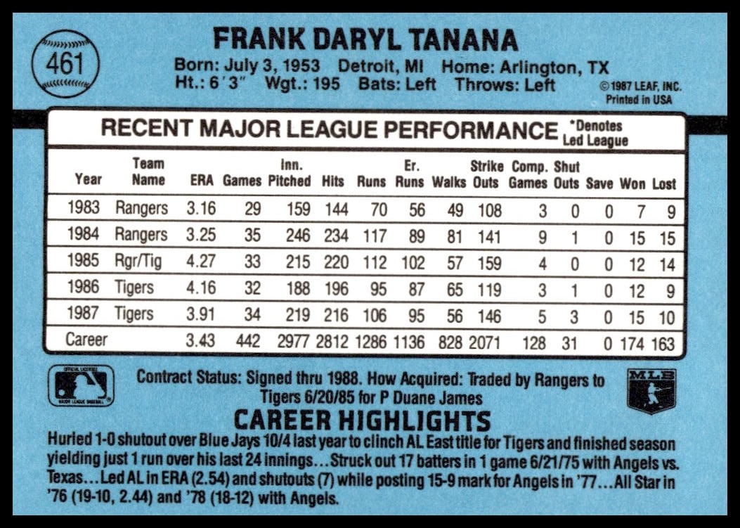 This Baseball card, from 1988 is part of the Donruss  card set. Frank Tanana is featured and has a card number of 461.