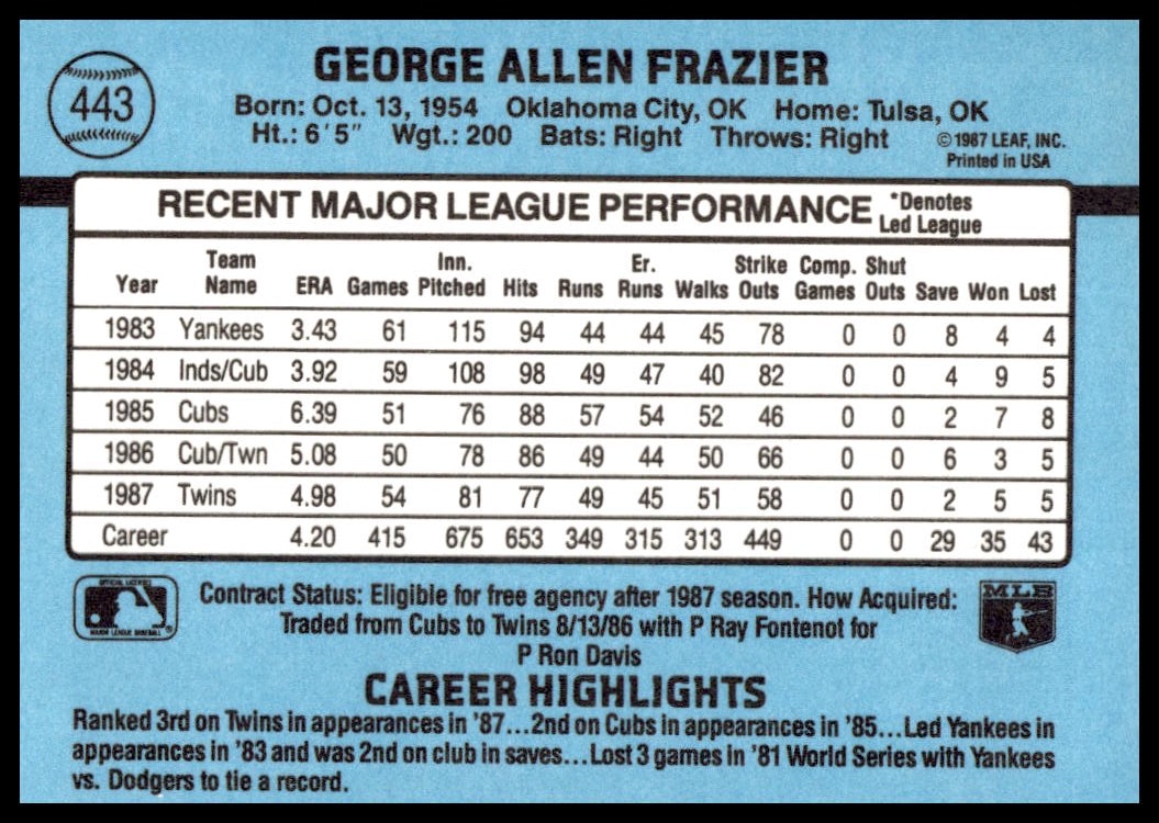 This Baseball card, from 1988 is part of the Donruss  card set. George Frazier is featured and has a card number of 443.