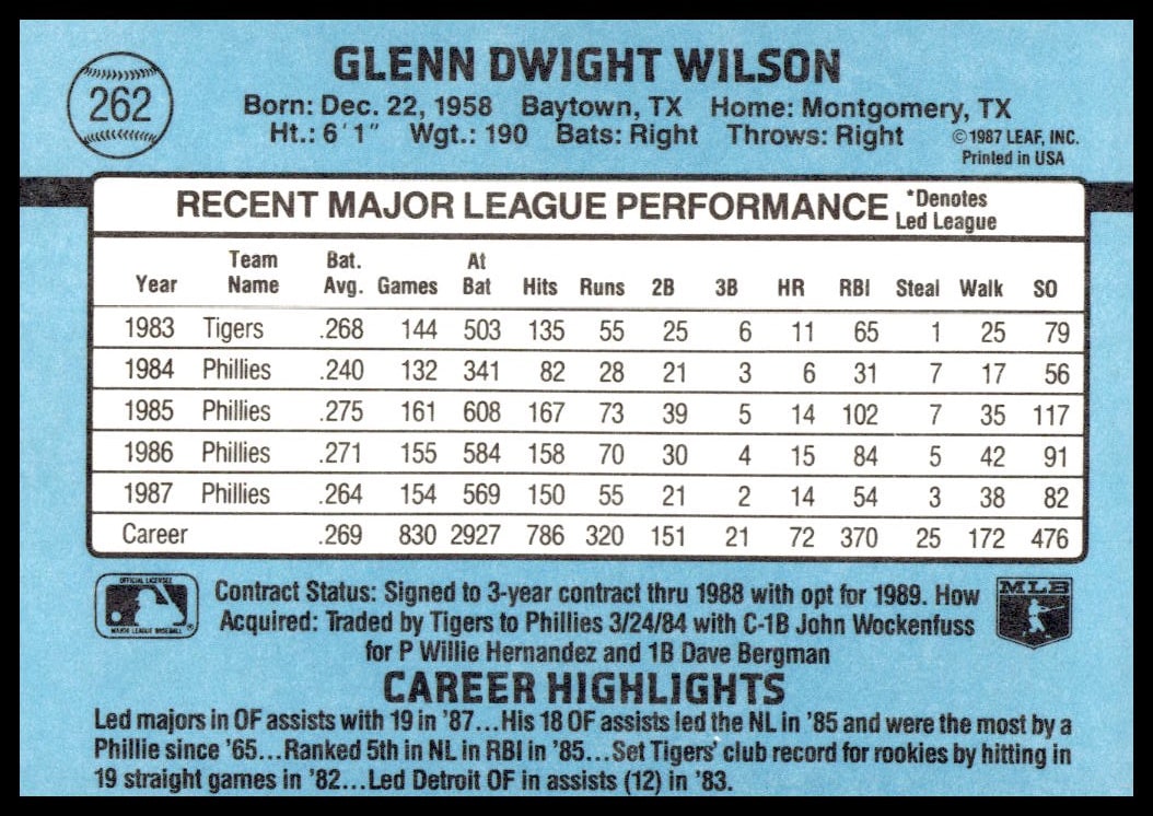 This Baseball card, from 1988 is part of the Donruss  card set. Glenn Wilson is featured and has a card number of 262.