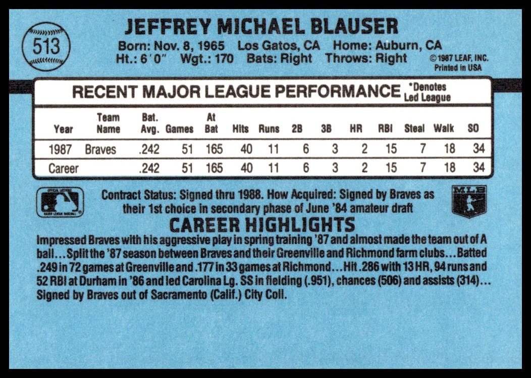 This Baseball card, from 1988 is part of the Donruss  card set. Jeff Blauser is featured and has a card number of 513.