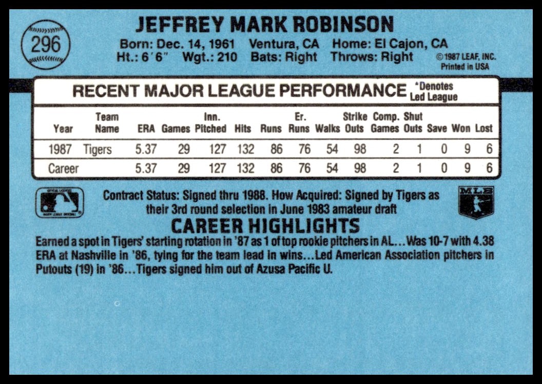 This Baseball card, from 1988 is part of the Donruss  card set. Jeff Robinson is featured and has a card number of 296.