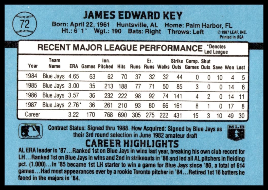This Baseball card, from 1988 is part of the Donruss  card set. Jimmy Key is featured and has a card number of 72.