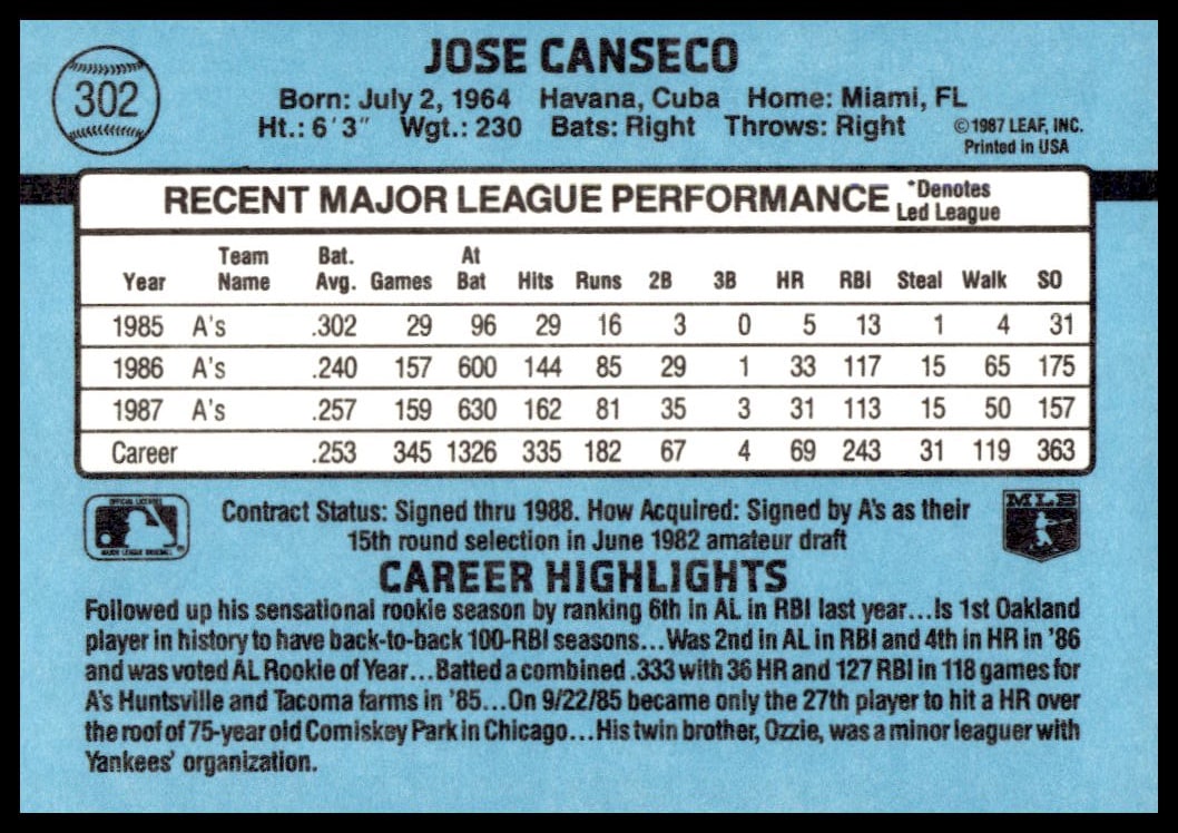 This Baseball card, from 1988 is part of the Donruss  card set. Jose Canseco is featured and has a card number of 302.