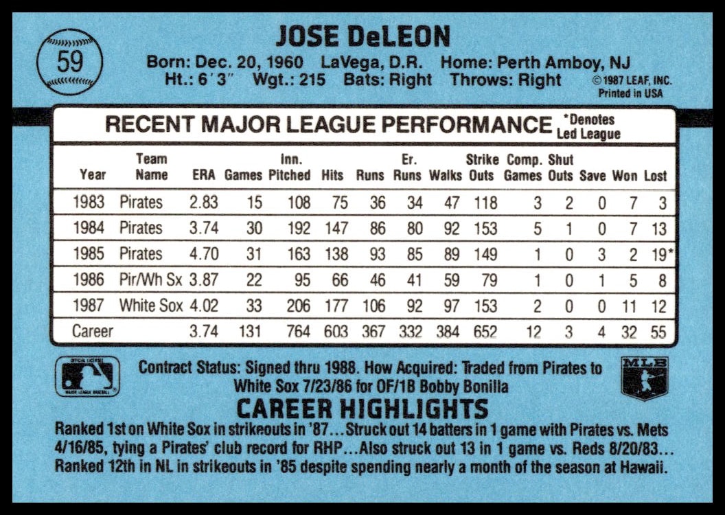 This Baseball card, from 1988 is part of the Donruss  card set. Jose DeLeon is featured and has a card number of 59.