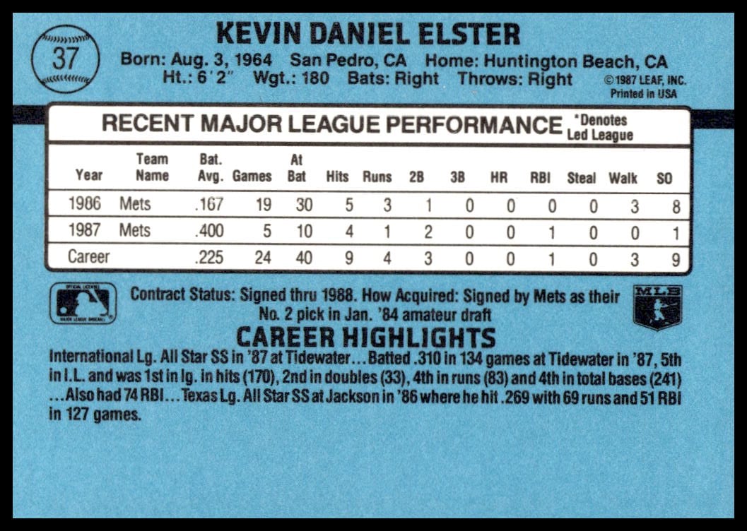 This Baseball card, from 1988 is part of the Donruss  card set. Kevin Elster is featured and has a card number of 37.