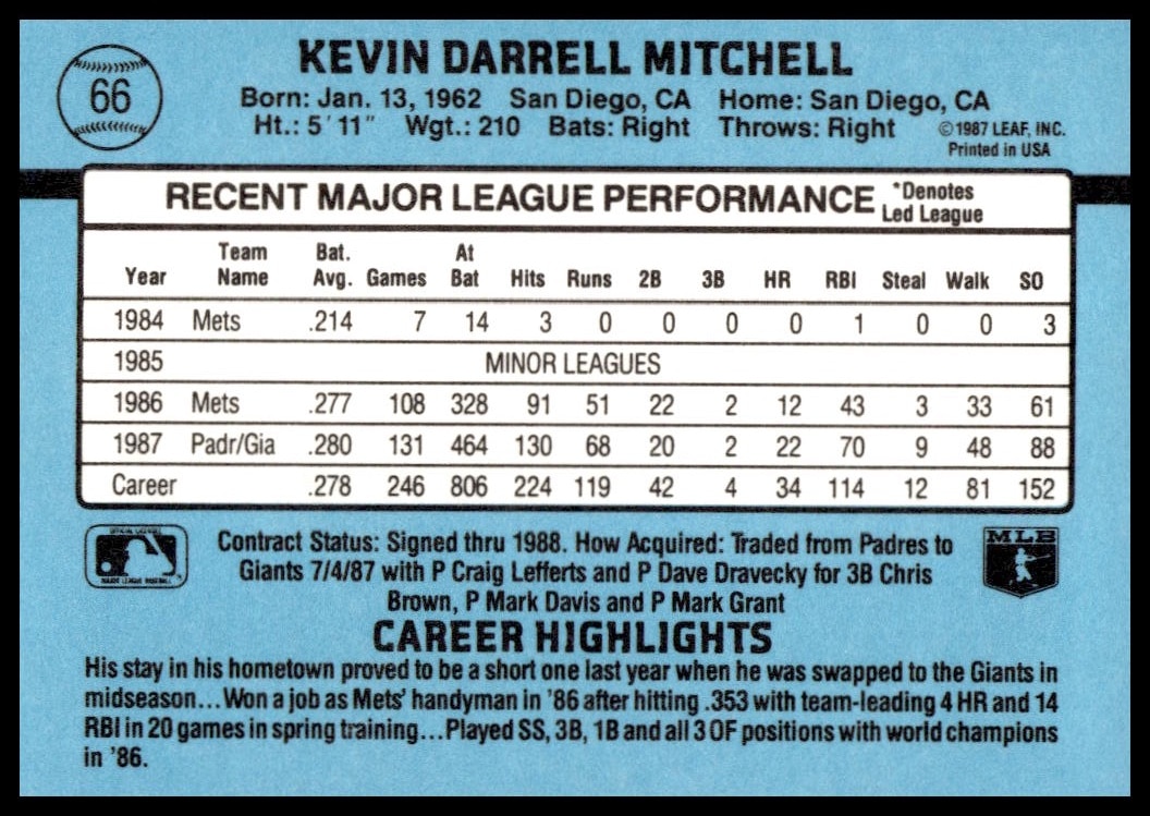 This Baseball card, from 1988 is part of the Donruss  card set. Kevin Mitchell is featured and has a card number of 66.