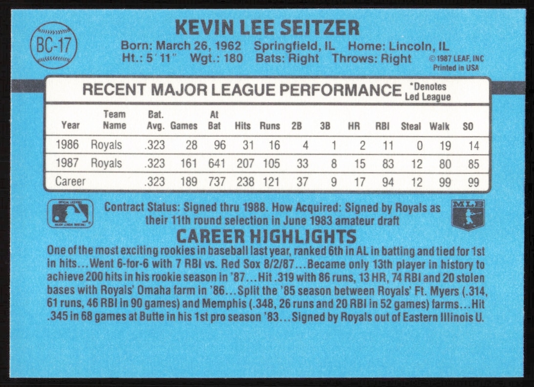 This Baseball card, from 1988 is part of the Donruss card set. Kevin Seitzer is featured and has a card number of BC-17.