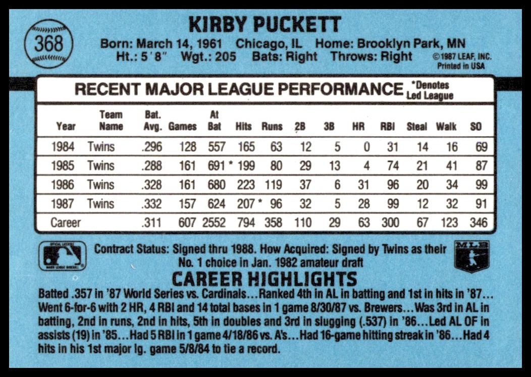 This BaseballΒ card, from 1988 is part of the Donruss Β card set. Kirby Puckett is featured and has a card number of 368.