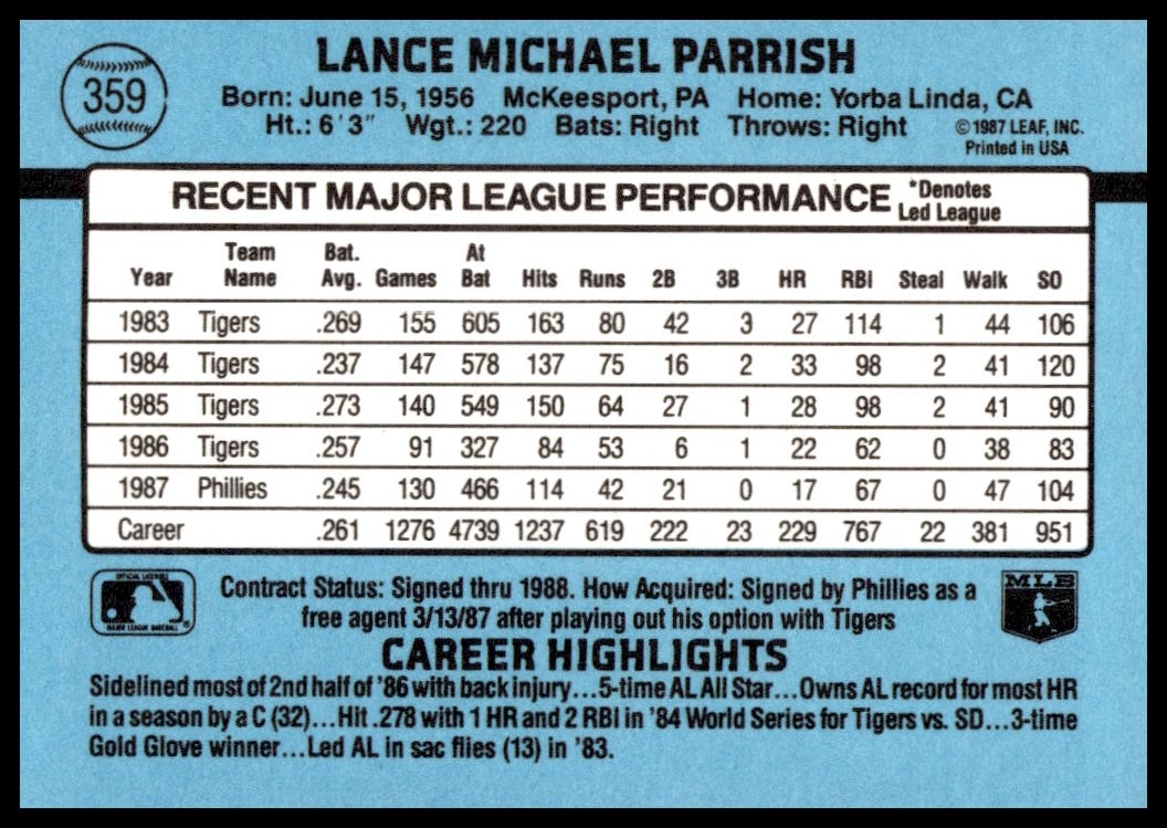 This Baseball card, from 1988 is part of the Donruss  card set. Lance Parrish is featured and has a card number of 359.