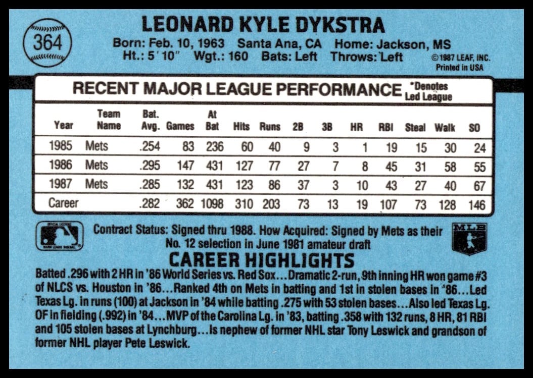 This Baseball card, from 1988 is part of the Donruss  card set. Len Dykstra is featured and has a card number of 364.