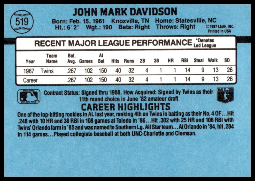 This BaseballΒ card, from 1988 is part of the Donruss Β card set. Mark Davidson is featured and has a card number of 519.
