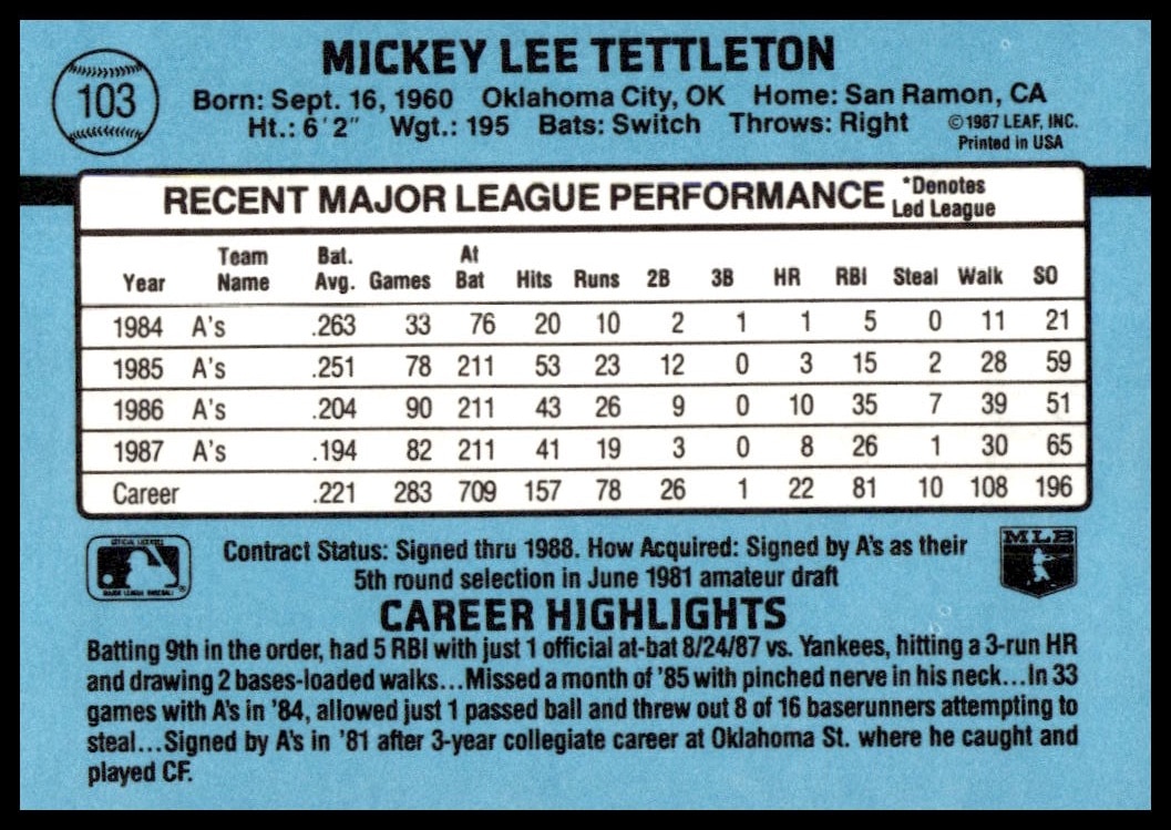 This Baseball card, from 1988 is part of the Donruss  card set. Mickey Tettleton is featured and has a card number of 103.