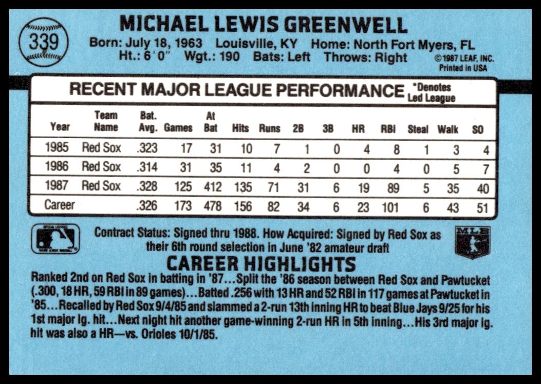 This BaseballΒ card, from 1988 is part of the Donruss Β card set. Mike Greenwell is featured and has a card number of 339.
