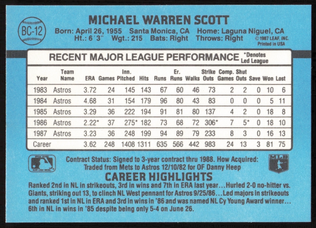 This Baseball card, from 1988 is part of the Donruss card set. Mike Scott is featured and has a card number of BC-12.