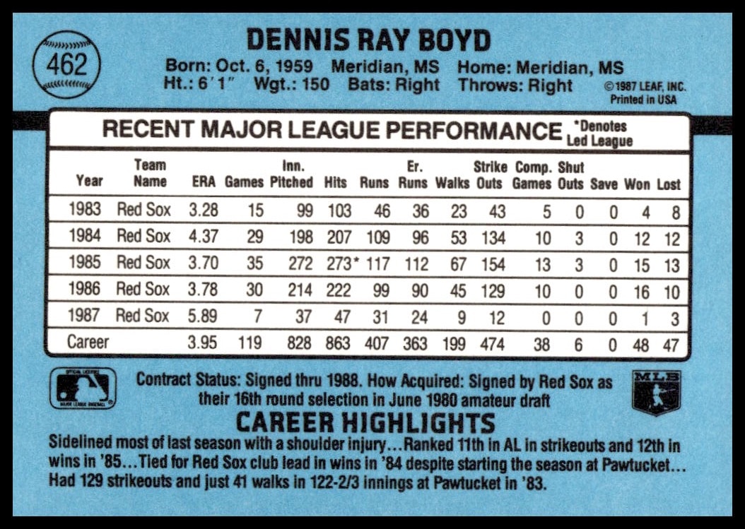 This Baseball card, from 1988 is part of the Donruss  card set. Oil Can Boyd is featured and has a card number of 462.