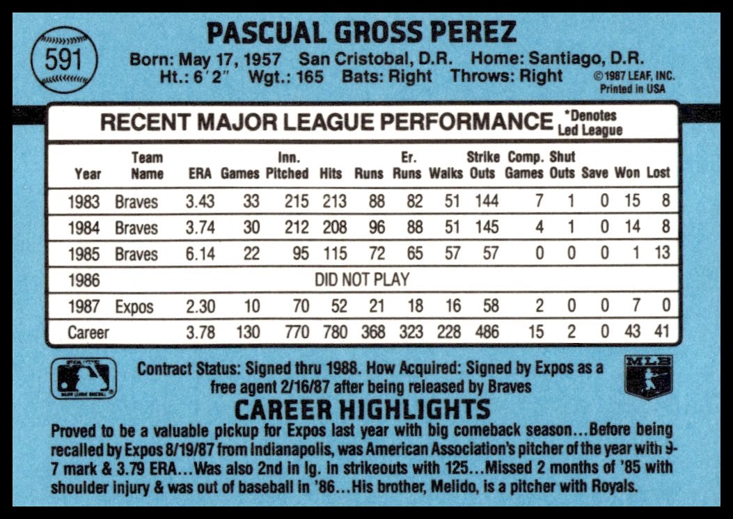 This Baseball card, from 1988 is part of the Donruss  card set. Pascual Perez is featured and has a card number of 591.
