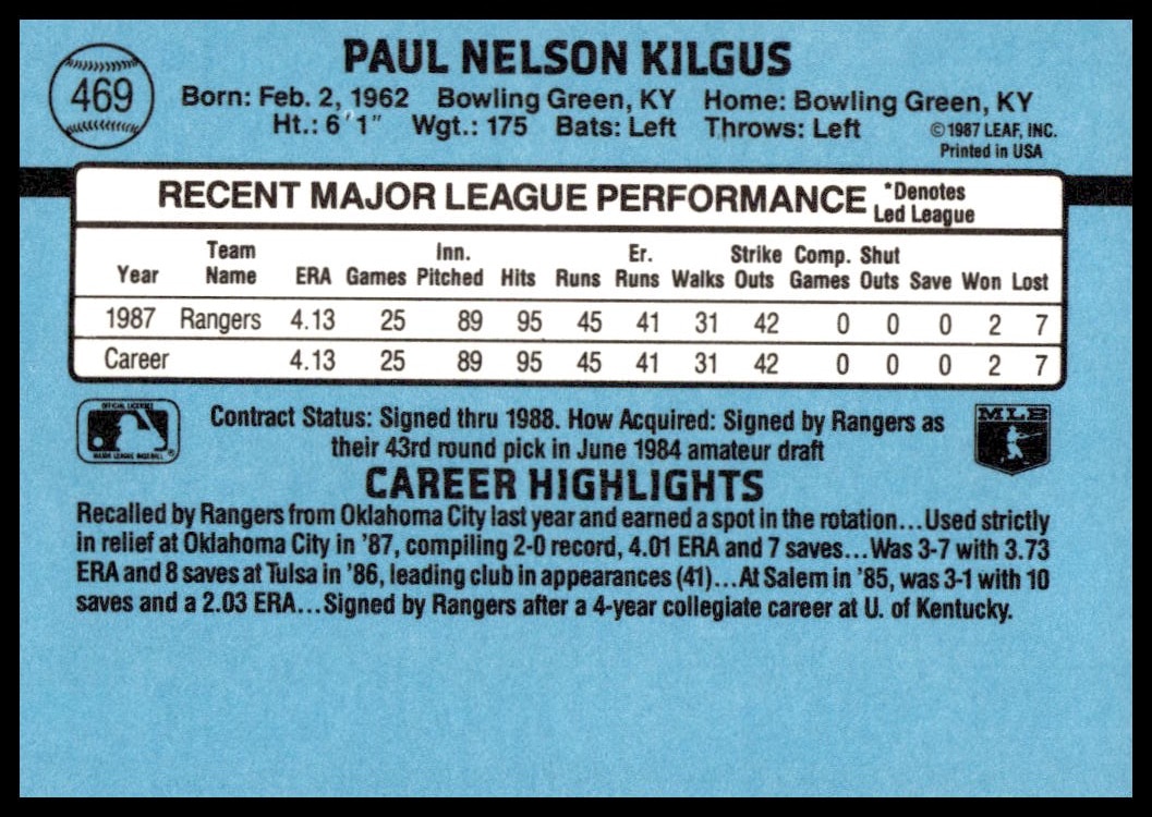 This Baseball card, from 1988 is part of the Donruss  card set. Paul Kilgus is featured and has a card number of 469.