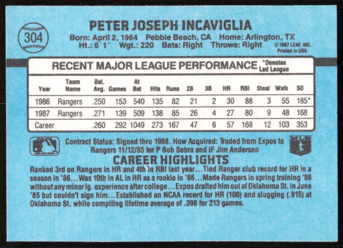 This Baseball card, from 1988 is part of the Donruss card set. Pete Incaviglia is featured and has a card number of 304.