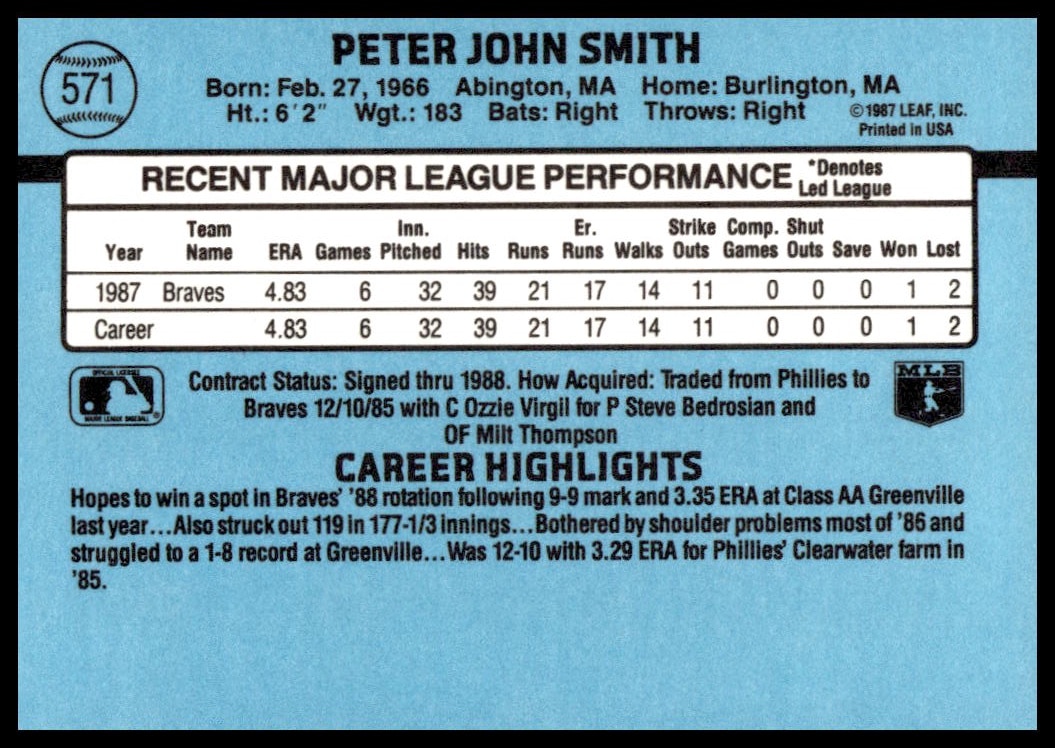 This Baseball card, from 1988 is part of the Donruss  card set. Pete Smith is featured and has a card number of 571.
