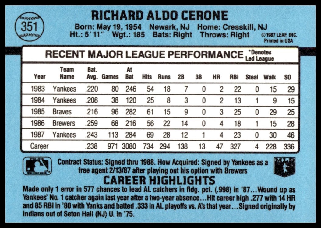 This Baseball card, from 1988 is part of the Donruss  card set. Rick Cerone is featured and has a card number of 351.