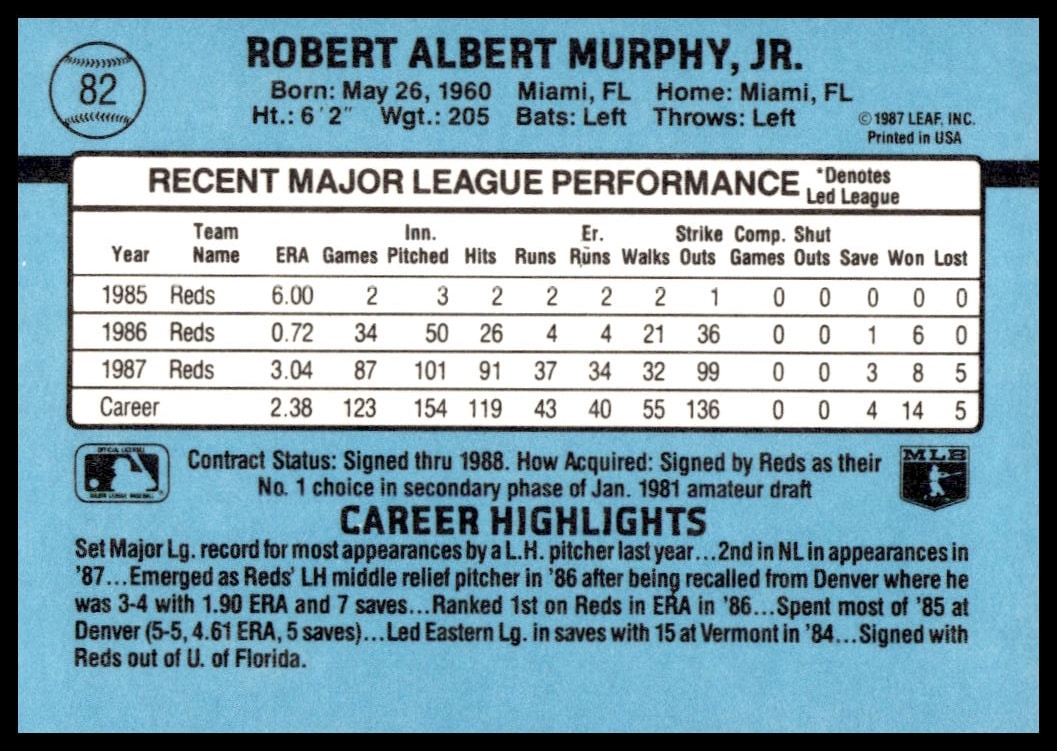 This Baseball card, from 1988 is part of the Donruss  card set. Rob Murphy is featured and has a card number of 82.