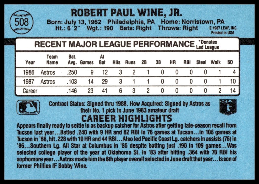This Baseball card, from 1988 is part of the Donruss  card set. Robbie Wine is featured and has a card number of 508.