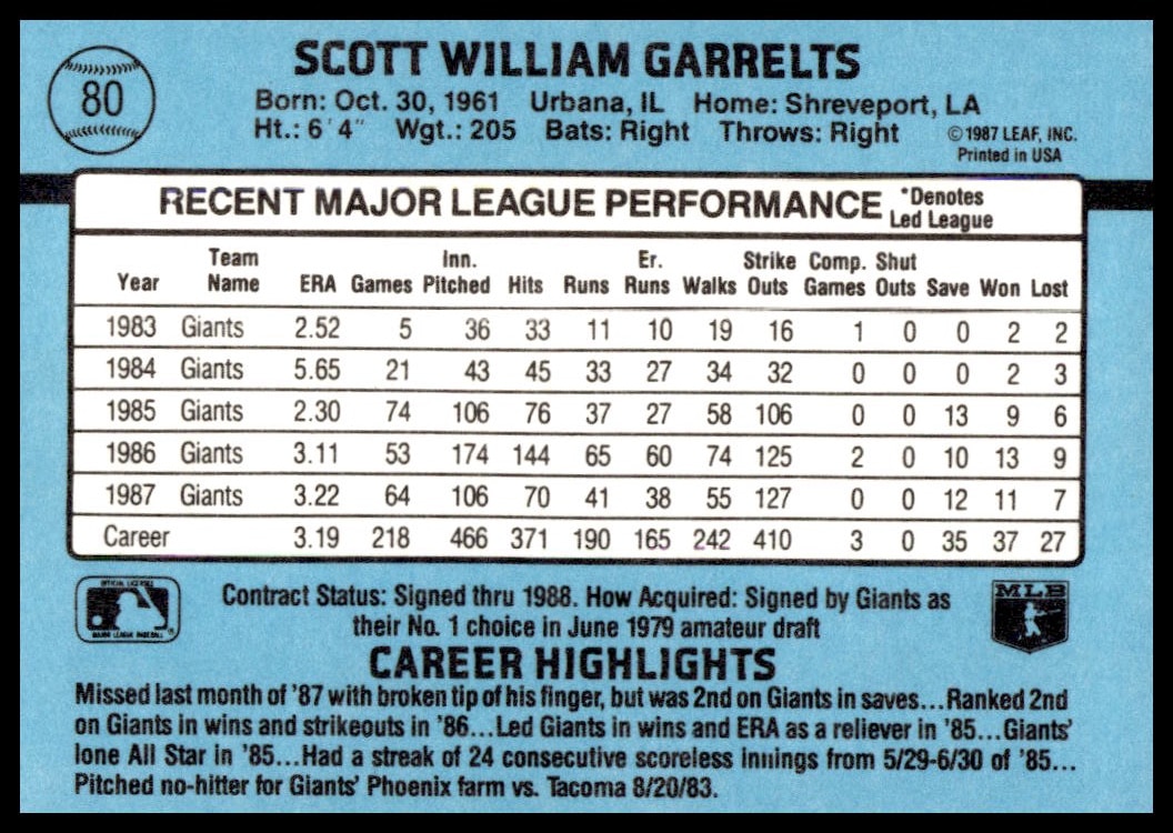 This Baseball card, from 1988 is part of the Donruss  card set. Scott Garrelts is featured and has a card number of 80.