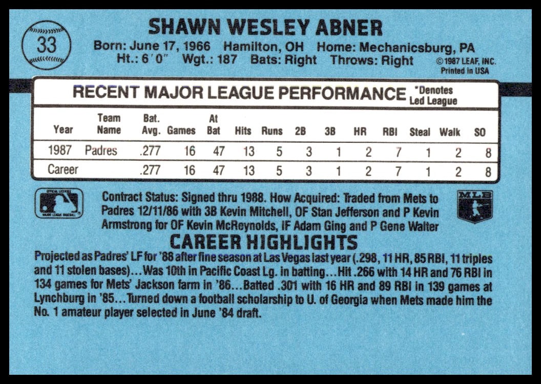 This Baseball card, from 1988 is part of the Donruss  card set. Shawn Abner is featured and has a card number of 33.