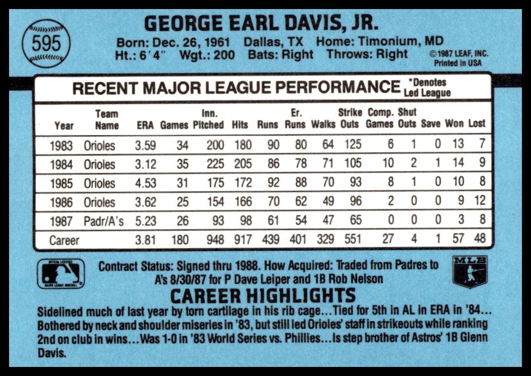 This Baseball card, from 1988 is part of the Donruss  card set. Storm Davis is featured and has a card number of 595.