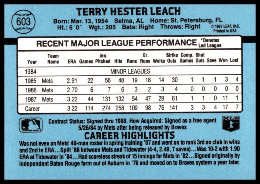 This Baseball card, from 1988 is part of the Donruss  card set. Terry Leach is featured and has a card number of 603.