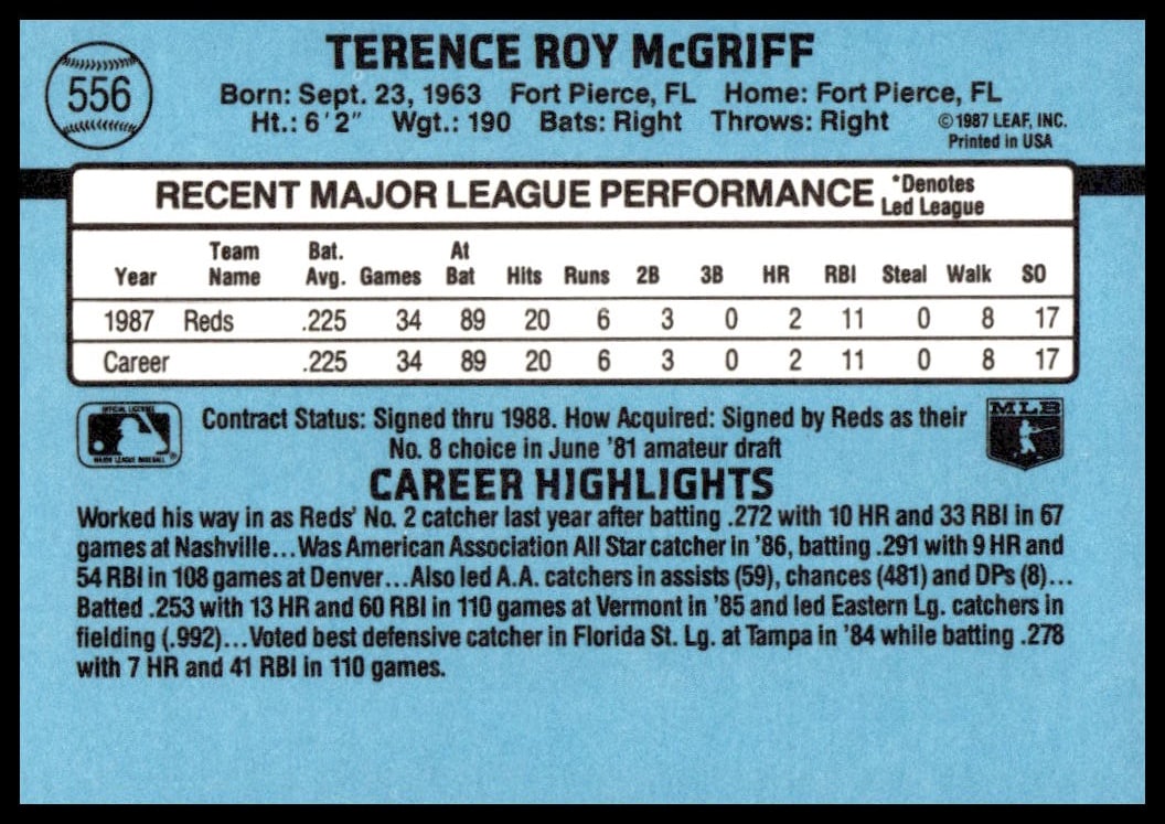 This Baseball card, from 1988 is part of the Donruss  card set. Terry McGriff is featured and has a card number of 556.