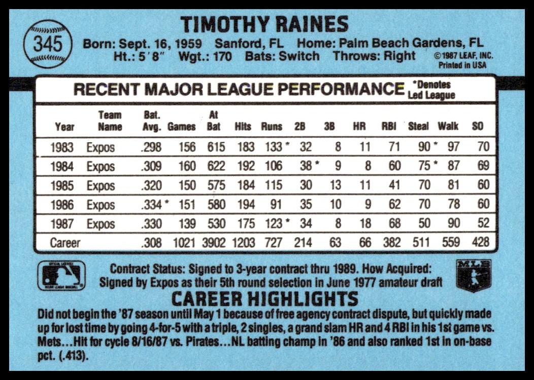 This Baseball card, from 1988 is part of the Donruss  card set. Tim Raines is featured and has a card number of 345.