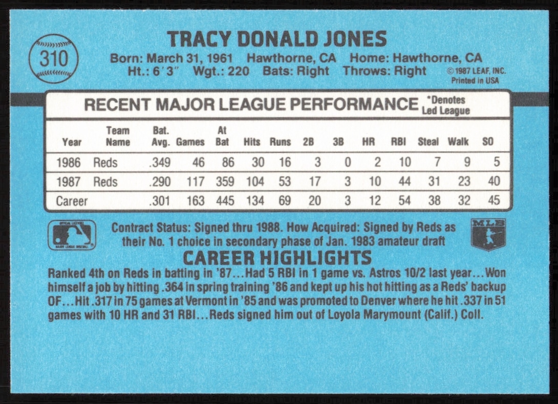 This Baseball card, from 1988 is part of the Donruss card set. Tracy Jones is featured and has a card number of 310.