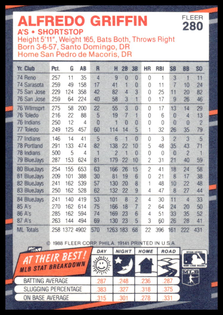 This Baseball card, from 1988 is part of the Fleer  card set. Alfredo Griffin is featured and has a card number of 280.
