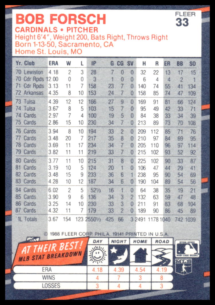 This Baseball card, from 1988 is part of the Fleer  card set. Bob Forsch is featured and has a card number of 33.