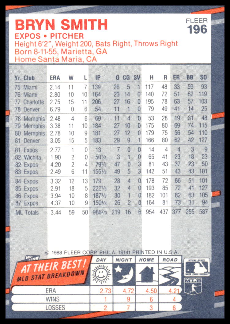 This Baseball card, from 1988 is part of the Fleer  card set. Bryn Smith is featured and has a card number of 196.
