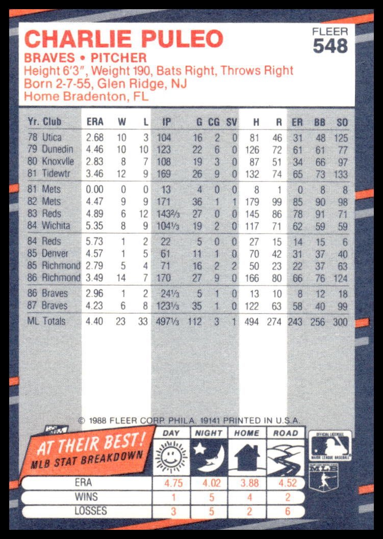 This Baseball card, from 1988 is part of the Fleer  card set. Charlie Puleo is featured and has a card number of 548.