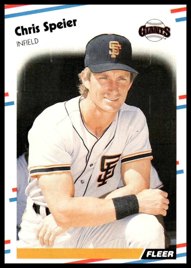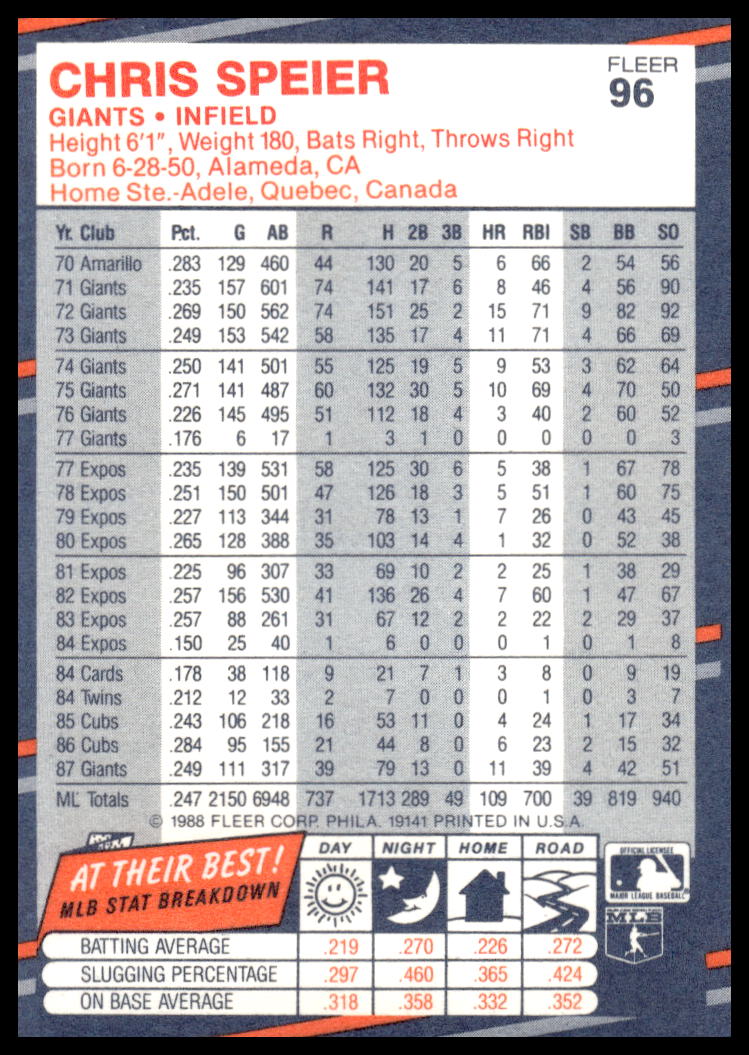 This Baseball card, from 1988 is part of the Fleer  card set. Chris Speier is featured and has a card number of 96.