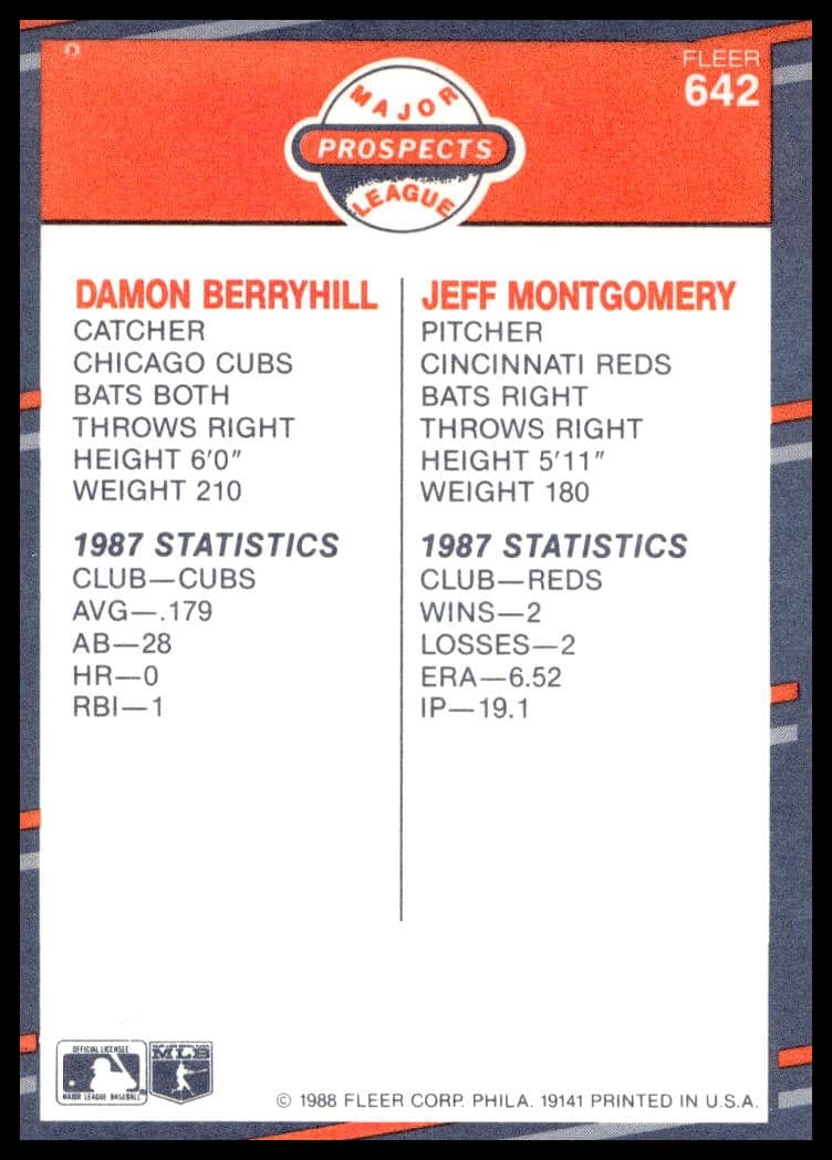 This BaseballΒ card, from 1988 is part of the Fleer Β card set. Damon Berryhill / Jeff Montgomery is featured and has a card number of 642.