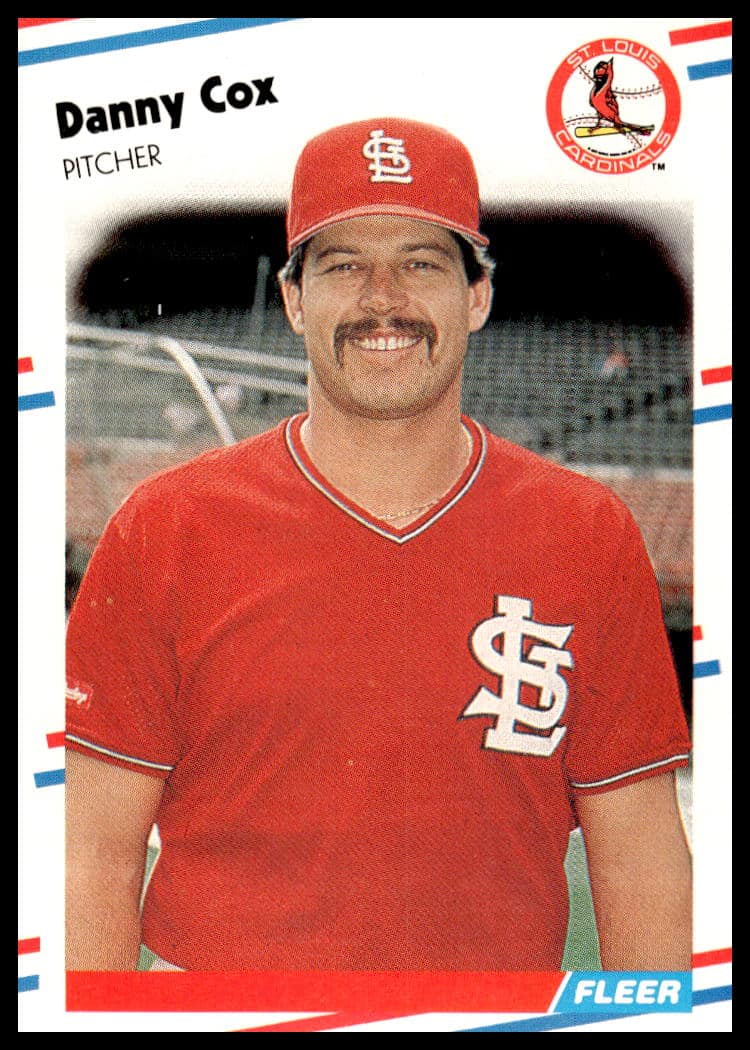 This Baseball card, from 1988 is part of the Fleer  card set. Danny Cox is featured and has a card number of 28.