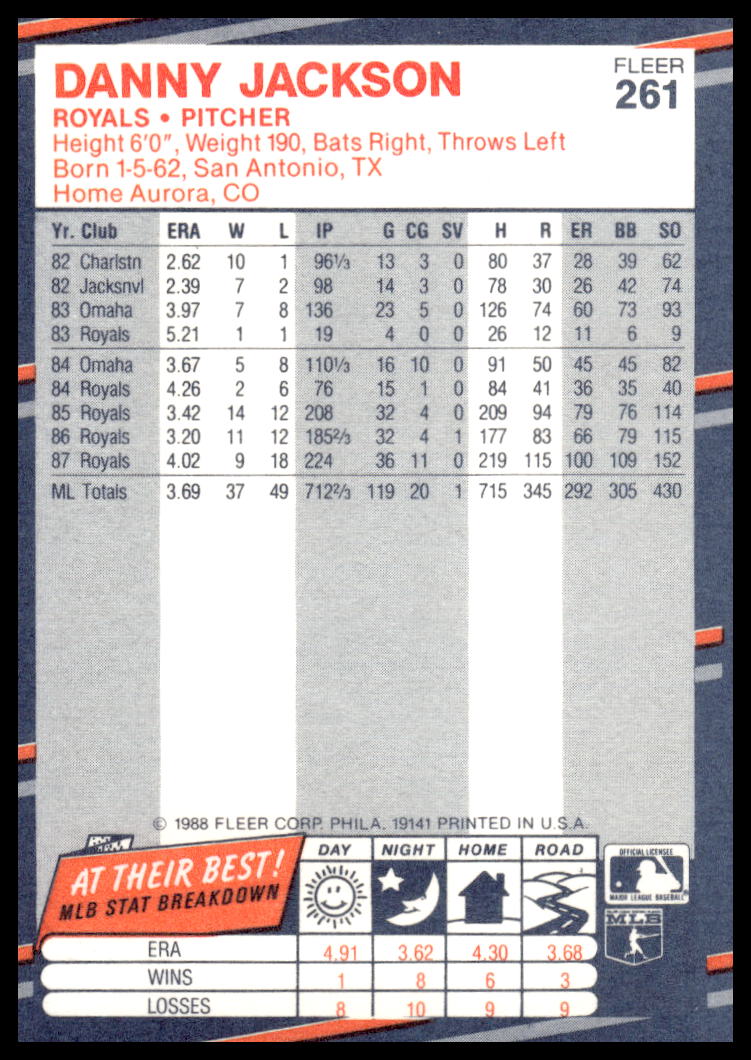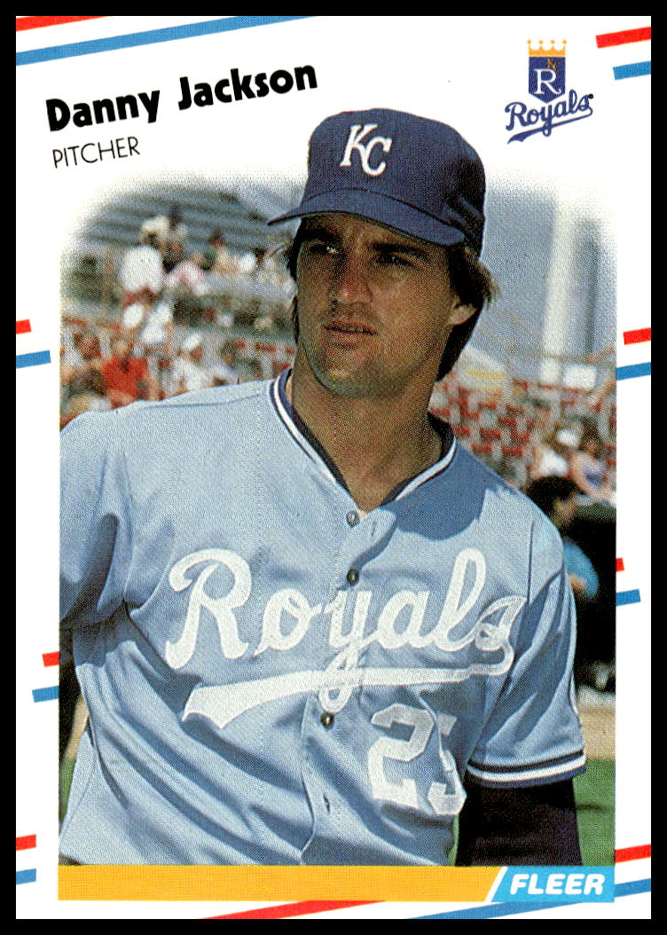 This Baseball card, from 1988 is part of the Fleer  card set. Danny Jackson is featured and has a card number of 261.