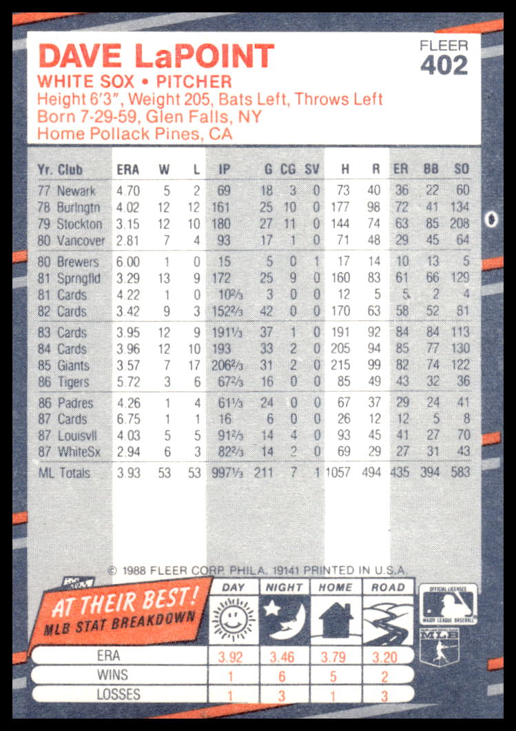 This Baseball card, from 1988 is part of the Fleer  card set. Dave LaPoint is featured and has a card number of 402.