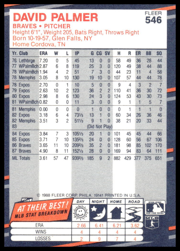 This Baseball card, from 1988 is part of the Fleer  card set. David Palmer is featured and has a card number of 546.